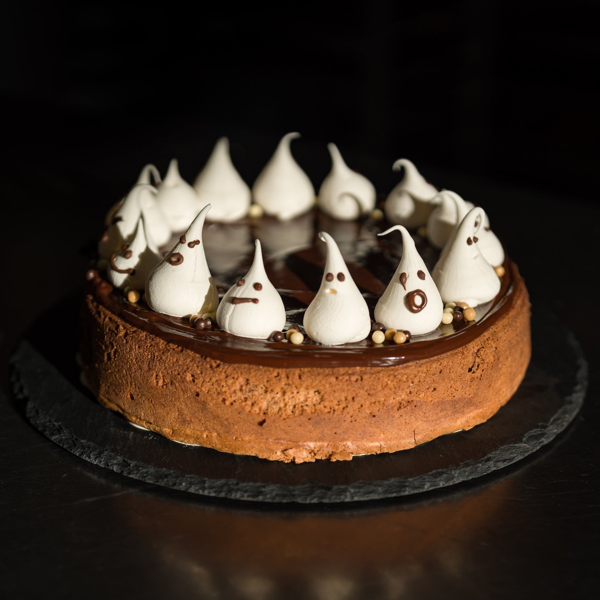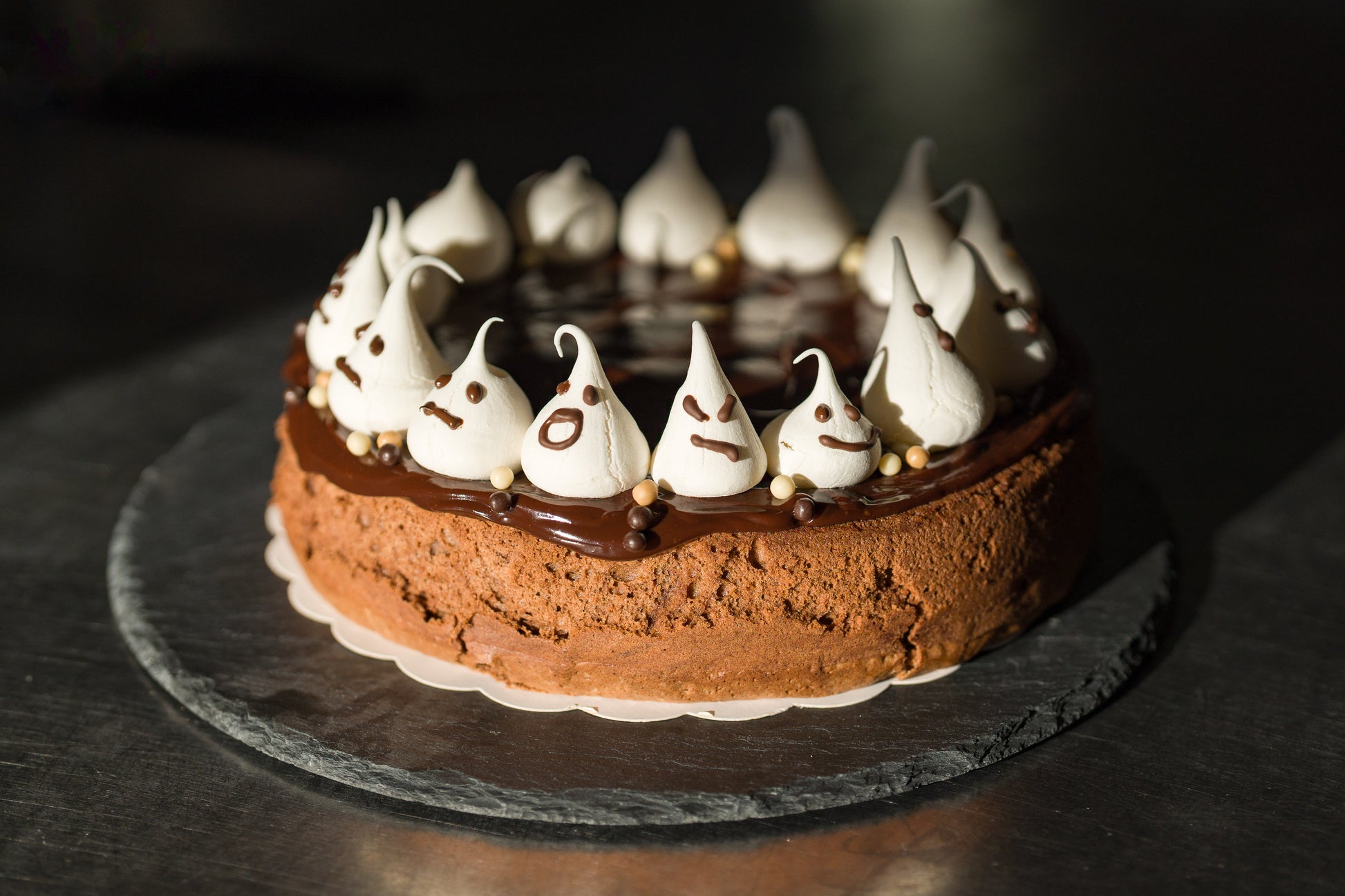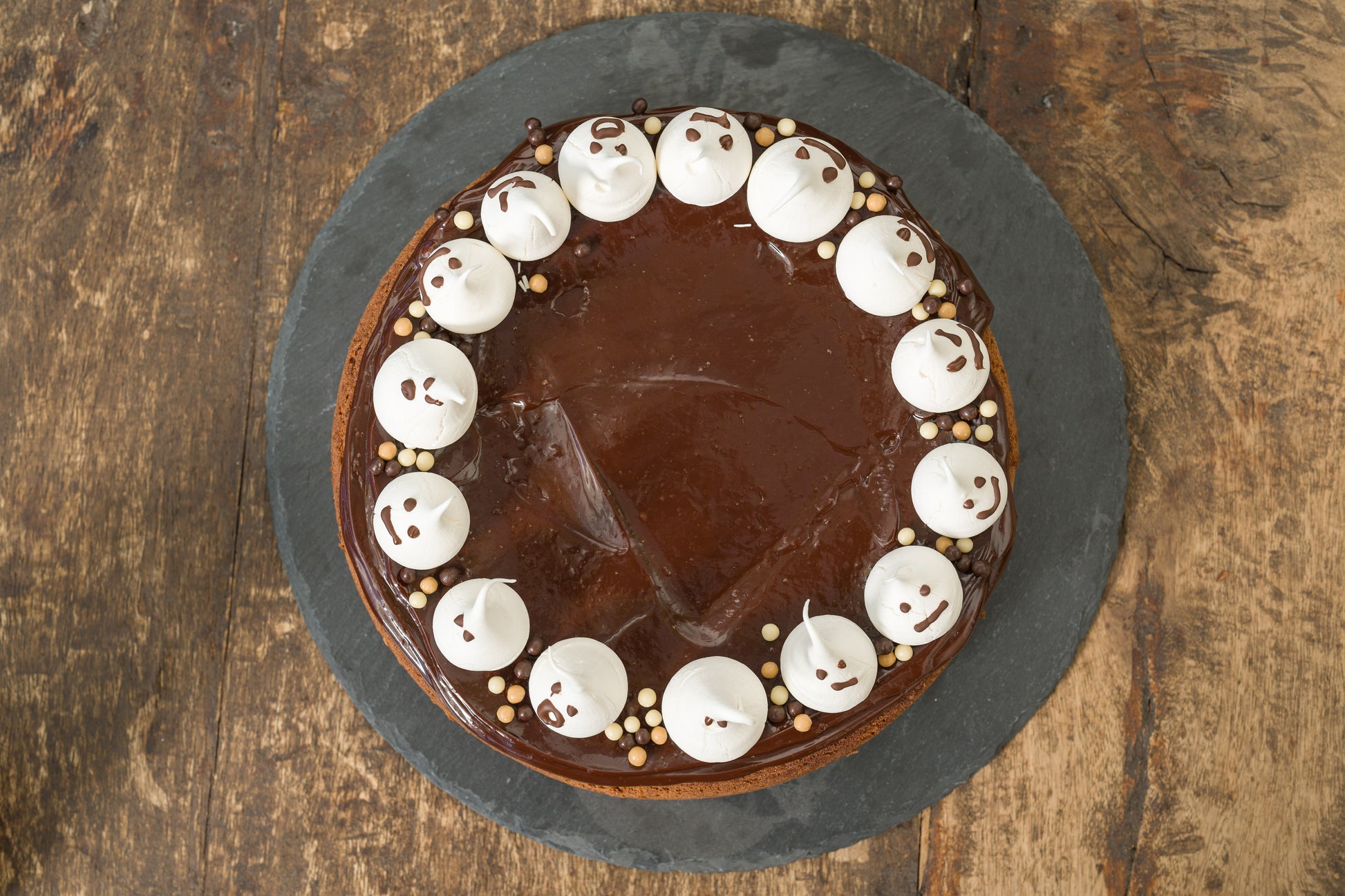 Feestelijke chocoladetaart met ganache en meringuespookjes, speciaal voor Halloween!