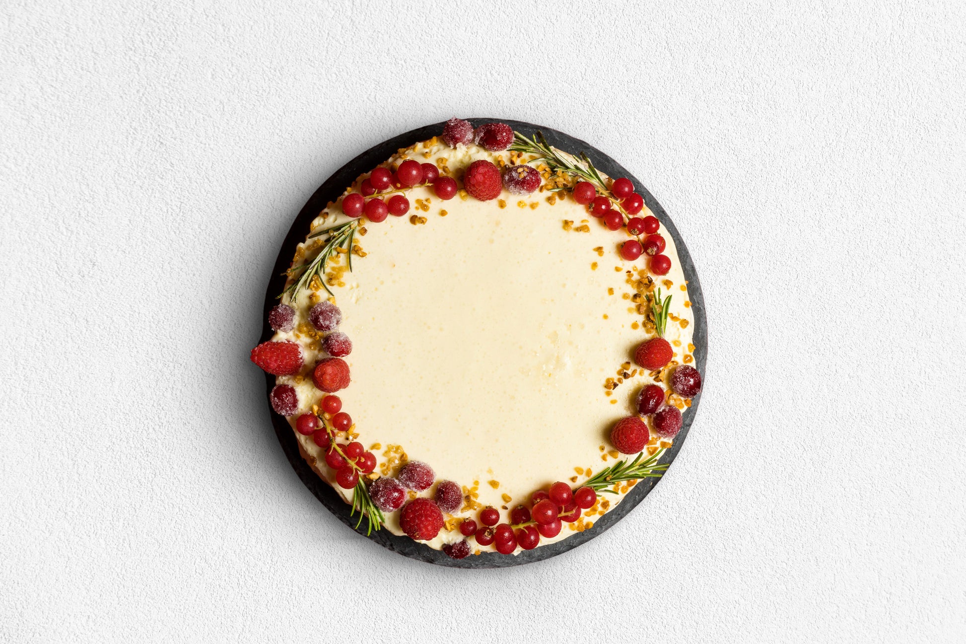 Witte chocolademousse met biscuit op een krokante bodem en feestelijk afgewerkt met rood fruit.